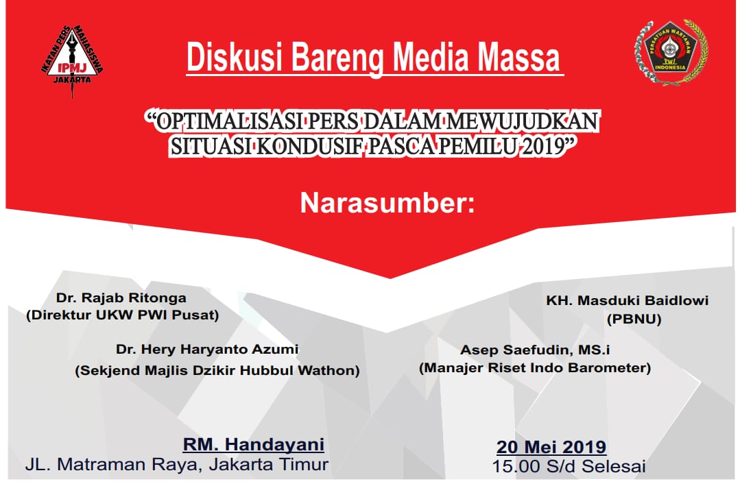 JAKARTA, Beritapublik.co.id – Ikatan Pers Mahasiswa Jakarta (IPMJ) berencana akan menggelar diskusi bareng media massa dengan mengangkat tema “Optimalisasi Pers Dalam Mewujudkan Situasi Kondusif Pasca Pemilu 2019”.