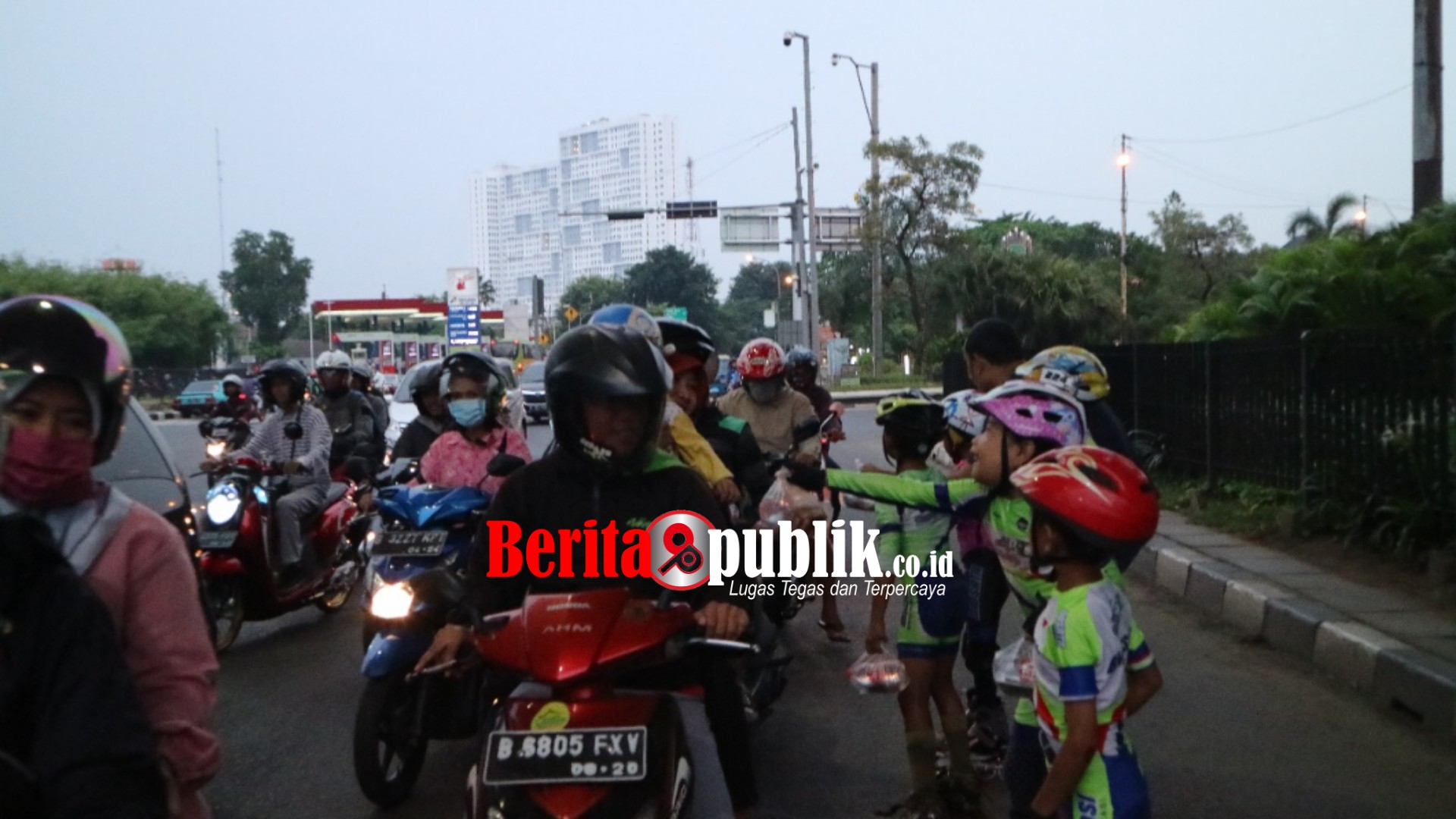 KOTA BEKASI, Beritapublik.co.id – PULUHAN anggota Bhagasasi Speed Club (BSC) turun ke jalan berbagi takjil untuk para pengendara yang tengah berhenti di lampu merah simpang Flyover KH Noer Alie, Senin (20/5).
